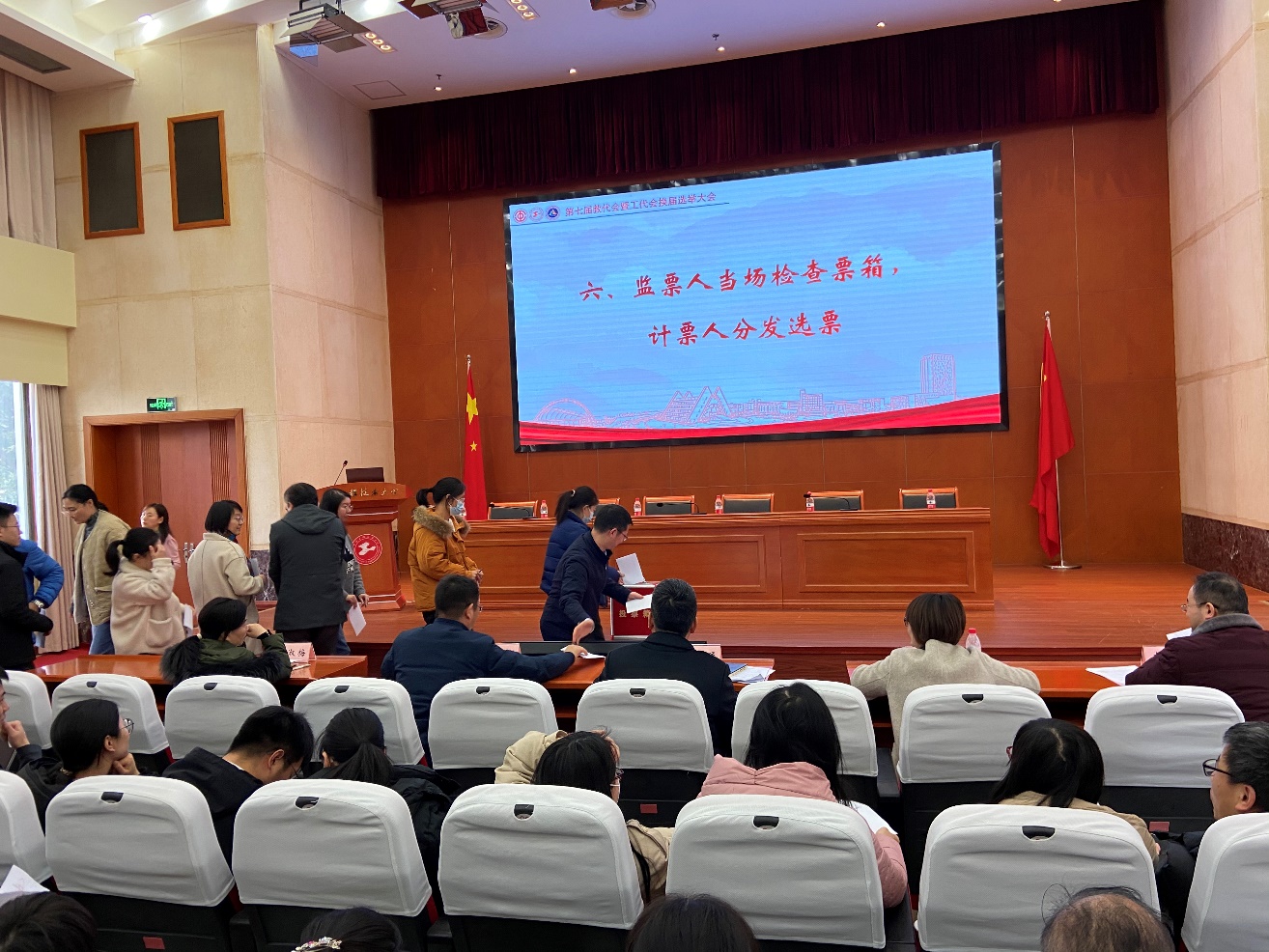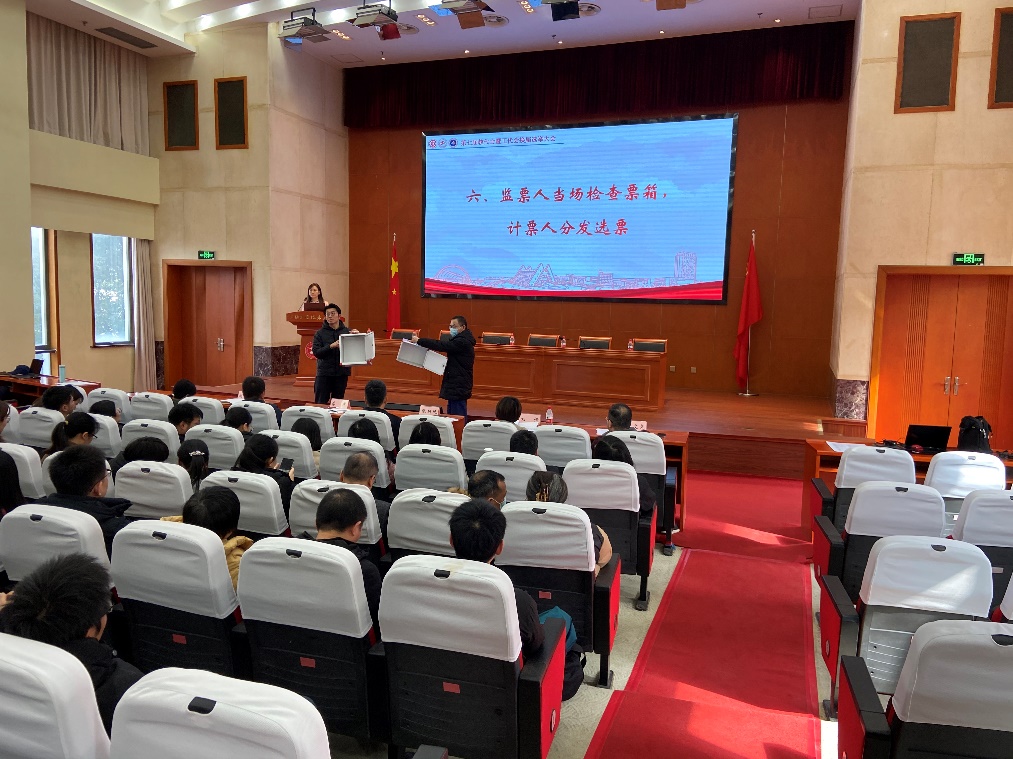 教代会代表选举大会在全体齐唱国歌声中开幕。会上宣读了《澳门网投十大信誉平台教职工代表大会选举办法》提交大会审议。该选举办法经大会现场举手表决,全体通过。随后大会审议通过了监票人和计票人名单,经大会审议举手表决,全体通过11位候选人建议名单。