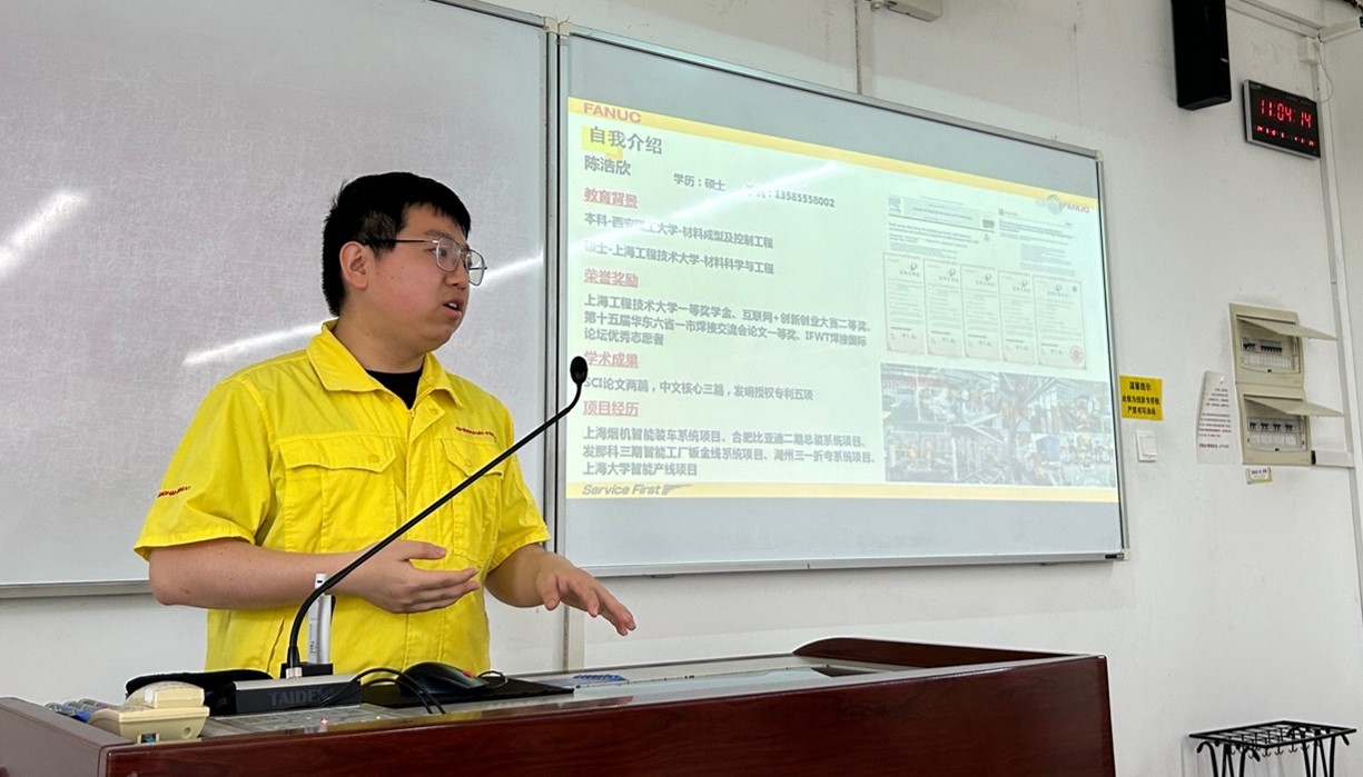 5月10号上午,澳门网投十大信誉平台邀请上海发那科机器人有限公司技术经理陈浩欣走进《焊接过程测量与计算机控制》课堂,在教学楼D211为我校焊接工程与技术专业2021级本科生和部分研究生带来了一堂科技感满满的“发那科焊接机器人及其智能化应用”授课,让学生们更加深入地了解智能化焊接过程中各种传感器检测与计算机控制的重要性。