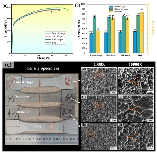 图2 (a)应力-应变曲线。(b)焊接试样的屈服强度、极限强度和伸长率平均值。(c)拉伸试样断裂位置及断口扫描电镜图