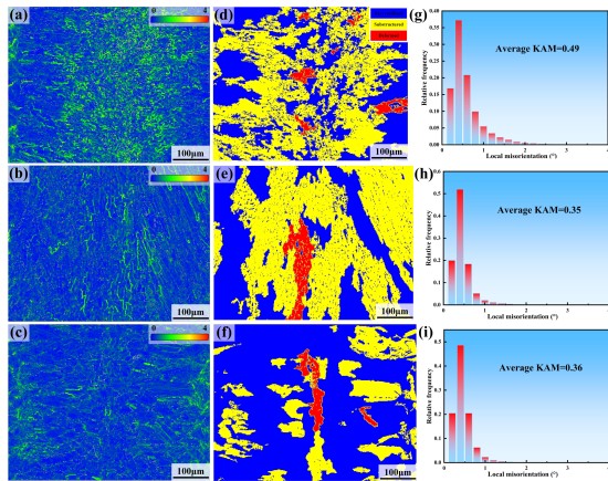 图1 (a-c)低角度晶界(0-4°)KAM图、(d-f) GOS图、(g-i) KAM分布图
