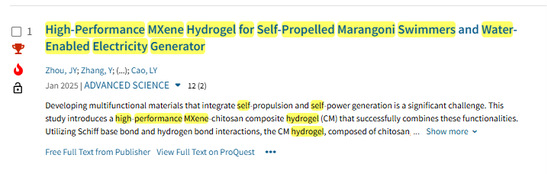 张艳副教授指导的研究生周浃燚在中科院一区期刊《Advanced Science》(2025,12(2): 2408161,IF=14.3)上,发表了题为 “High‐Performance MXene Hydrogel for Self‐Propelled Marangoni Swimmers and Water‐Enabled Electricity Generator” 的研究成果,为智能材料在能源转换与驱动领域的应用提供了全新的思路和方法。该论文不仅成功入选 ESI 高被引论文,还荣登 Hot-paper 热点论文榜单。