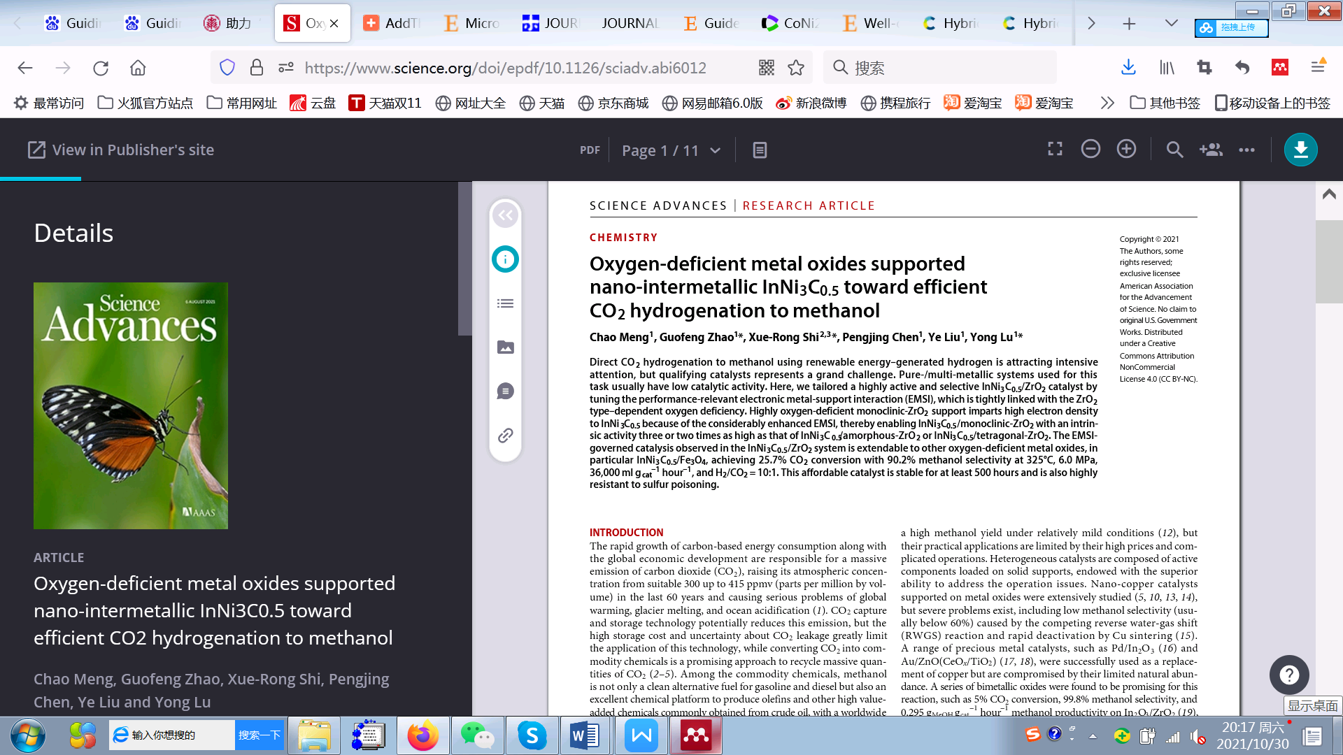 近期,我校材料工程学院史雪荣副教授与华东师范大学化学与分子工程学院、上海市绿色化学与化工过程绿色化重点实验室路勇教授课题组在二氧化碳CO2加氢高效合成甲醇的研究中取得重要进展,相关成果“Oxygen-deficient metal oxides supported nano-intermetallic InNi3C0.5 towards efficient CO2 hydrogenation to methanol”发表于Science出版集团子刊《Science Advances》上(2021, 7(32), DOI: 10.1126/sciadv.abi6012)。博士生蒙超为论文第一作者,澳门网投十大信誉平台史雪荣副教授、华东师范大学路勇教授、赵国锋副研究员为论文共同通讯作者。