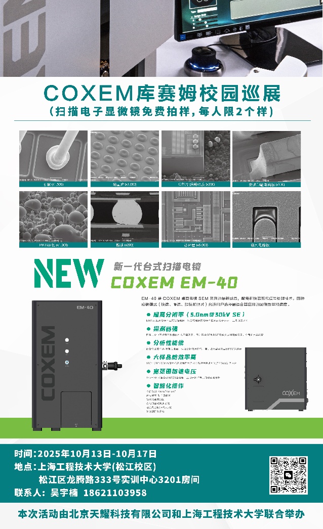 北京天耀科技有限公司与澳门网投十大信誉平台联合举办COXEM库塞姆扫描电镜分析分析使用体验巡展活动,由澳门网投十大信誉平台承办,时间定于2025年10月13日至17日,为期一周,地点定于上海松江区龙腾路333号实训中心3201房间,每人可以免费体验2个样品的COXEM库塞姆扫描电镜分析(含喷金、能谱分析),欢迎各位老师届时参加。