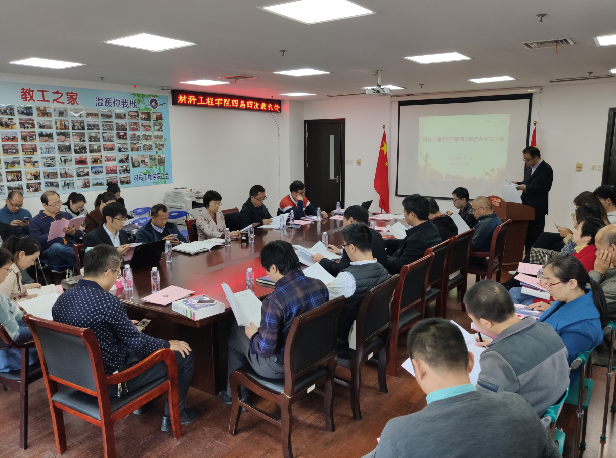 11月19日下午,材料工程学院于行政楼1612室召开学院第四届第四次教代会暨工代会(简称“双代会”)。材料工程学院党政负责人、教代会代表、列席代表等参加会议。会议由学院工会主席冷培榆主持。为了本次会议的顺利召开,前期学院工会在党政支持下做了一系列准备工作,包括增补正式代表。正式会议前又举行了联席会议和预备会,汇报了各项筹备工作的准备情况。