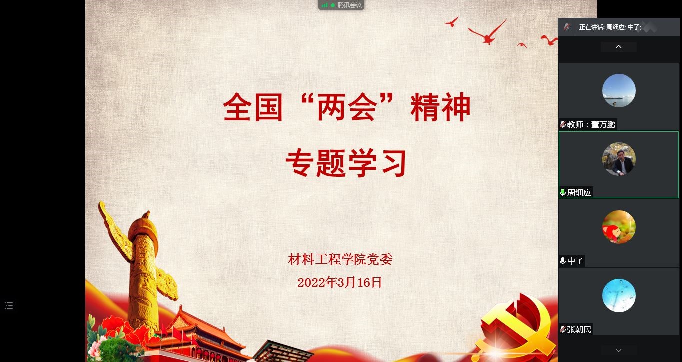3月16日下午,材料工程学院党委中心组采用线上会议形式专题学习2022年全国两会精神,学院党政班子成员、党委委员参加会议,会议由张朝民书记主持。