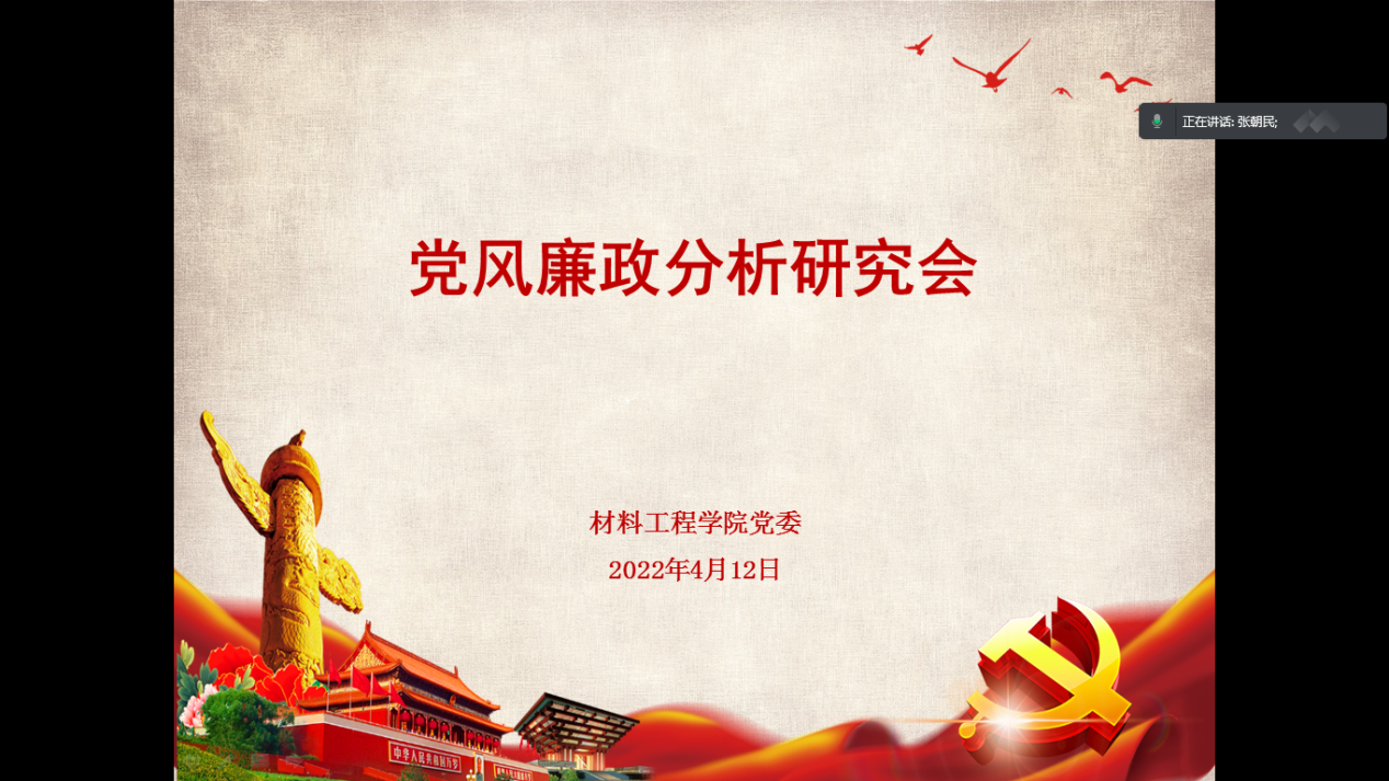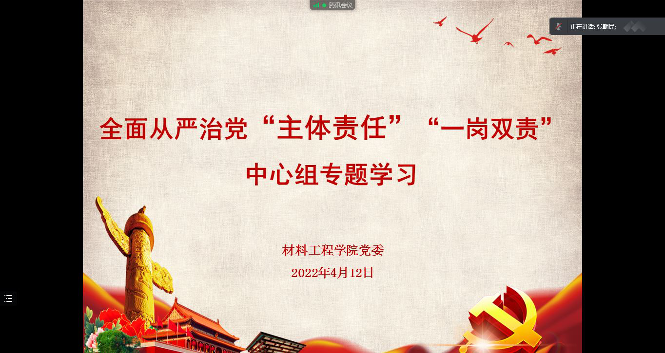 为贯彻落实中央、市纪委全会精神和市委、学校党委管党治党有关要求,4月12日上午,材料工程学院党委线上召开全面从严治党“主体责任”“一岗双责”专题学习会。学院党政班子成员参加会议,会议由学院党委书记张朝民主持。