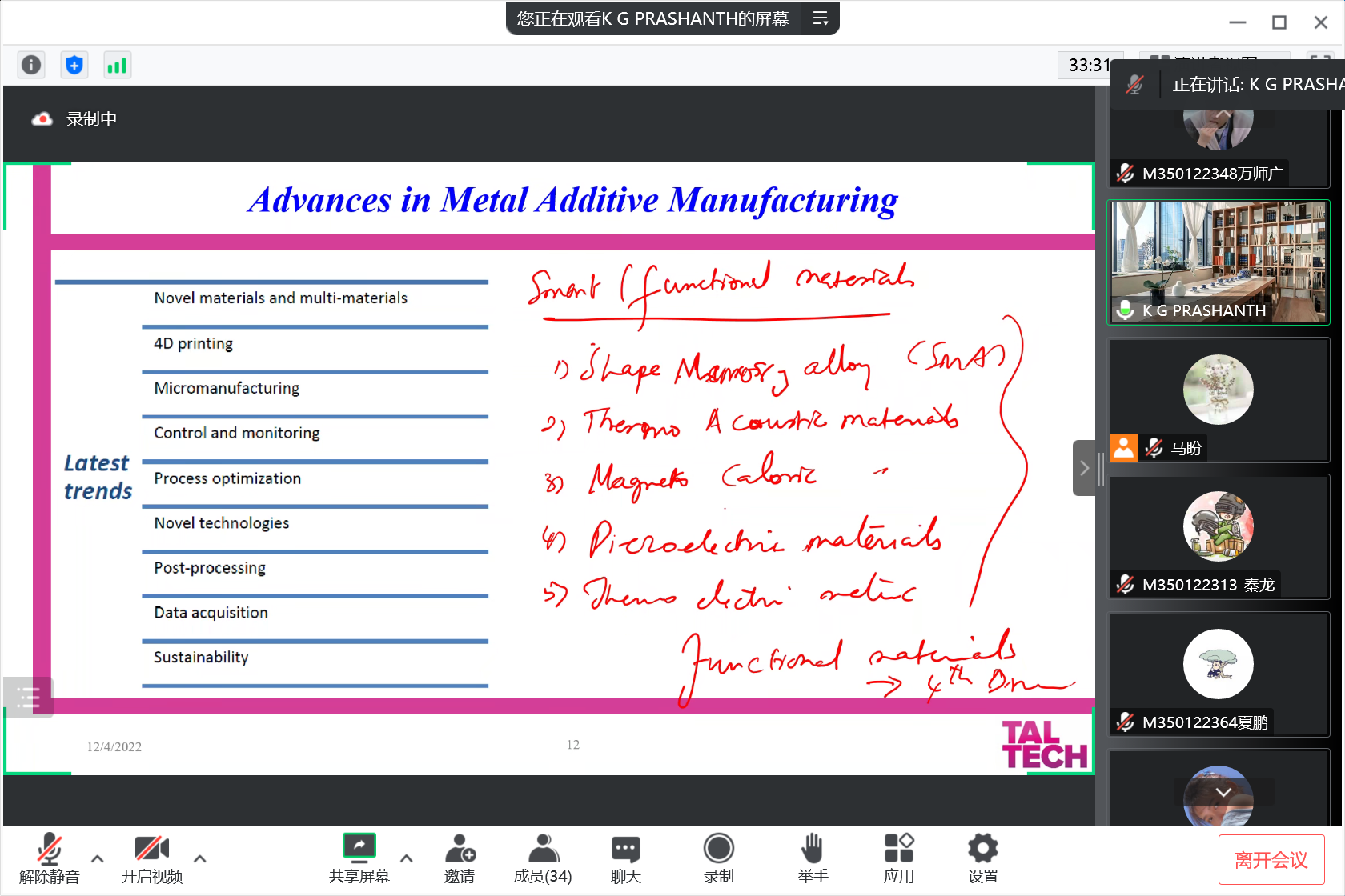12月4日,来自塔林理工大学机械与工业工程系,国际材料与制造工程委员会委员、国际先进材料科学家Prashanth Konda Gokuldoss教授,为材料学院师生开展了一场题为“Advances in metal Additive Manufacturing”的线上学术讲座,与参加讲座的师生们分享了关于金属增材制造产品优异性能方面的诸多专业知识,此外,还对金属增材制造研究方向做了详细的讲解,为学生们提供了社会前沿的专业领域知识。