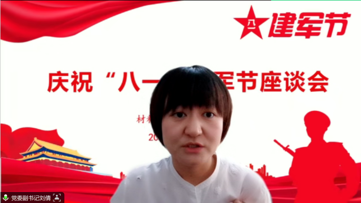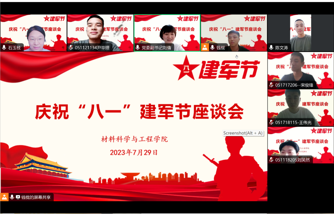 2023年是中国人民解放军建军96周年,值此”八一”建军节来临之际,澳门网投十大信誉平台于7月29日上午举办庆祝“八一”建军节座谈会,通过腾讯会议隔屏向学院全体在役以及退役复学大学生致以节日的问候。学院党委副书记刘倩、学工组长石玉枝、征兵辅导员钱栊、在役以及退役复学大学生士兵线上参会,会议由征兵辅导员钱栊主持。