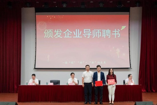 学院领导为优秀校友、学院产业学院——上海市激光技术研究所有限公司张瑄珺,普陀区政协委员、上海隆振节能科技股份有限公司董事长、安慈基金会发起人吴涛涛颁发企业导师证书。